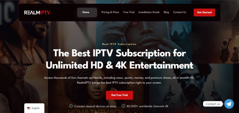 RealmIPTV offers the best IPTV subscription with 40,000+ live channels, 150K+ VOD, HD/4K streaming, multi-device support, anti-freeze tech and 24/7 assistance.