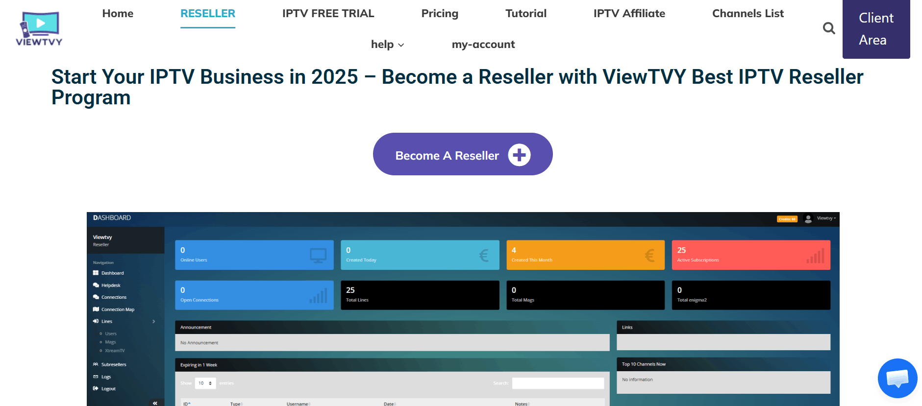 The ViewTVY IPTV Reseller Program is designed for entrepreneurs, freelancers, and small businesses who want to sell IPTV subscriptions without managing servers or streaming infrastructure. Resellers use a web-based control panel to create, extend, and manage customer accounts, set their own pricing, and grow a subscription business across different regions.